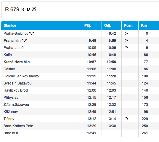 For our desired train routes, the following graphics represent portions of the search results from the Czech Railways webpage; “příjezd” and “odjezd” are “arrival” and “departure”, respectively.