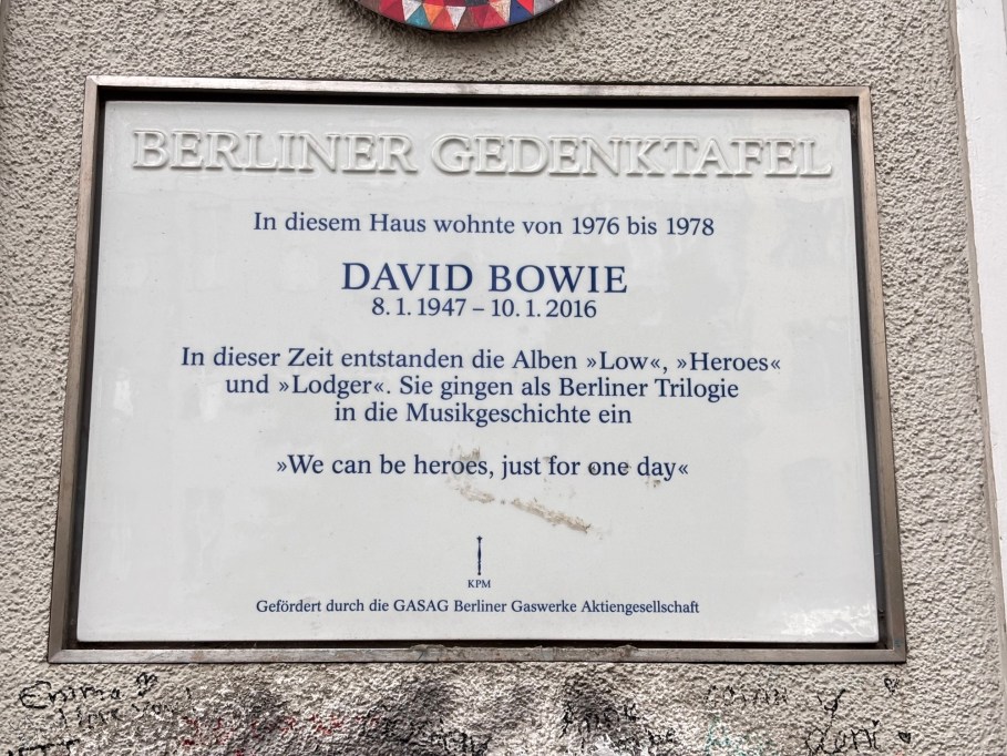 In diesem Haus wohnte von 1976 bis 1978 David Bowie (8 Jan 1947 – 10 Jan 2016). In dieser Zeit entstanden die Alben “Low”, “Heroes”, and “Lodger”. Sie gingen als Berliner Trilogie in die Musikgeschichte ein. (David Bowie lived in this building from 1976 to 1978. During this time, he created the albums “Low,” “Heroes,” & “Lodger”, known as the Berlin Trilogy.
