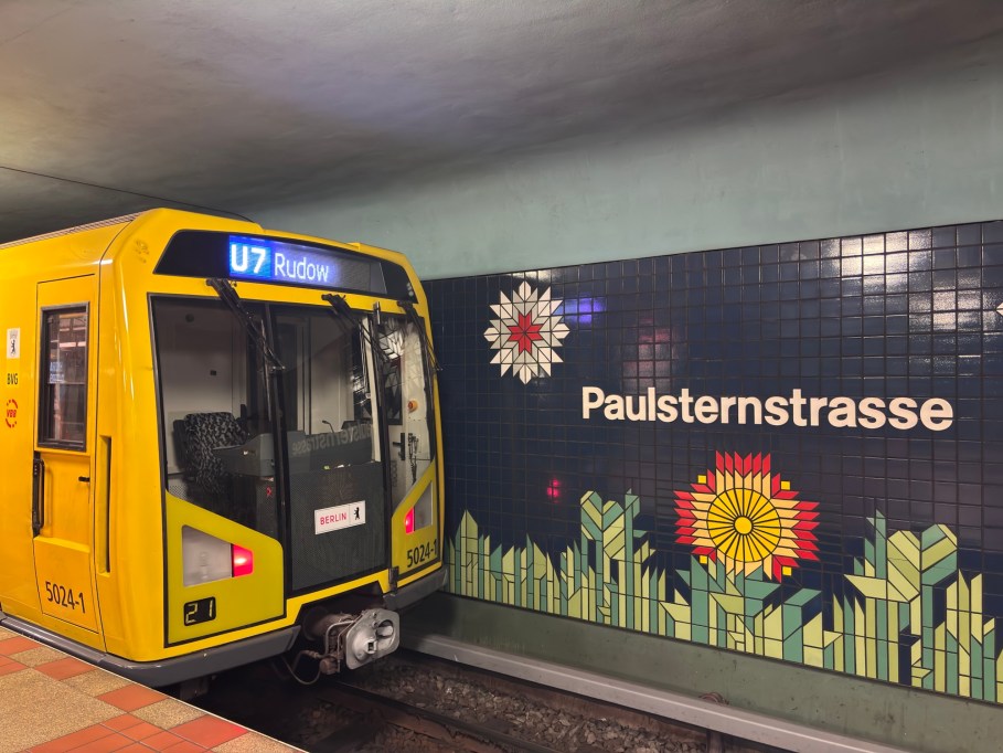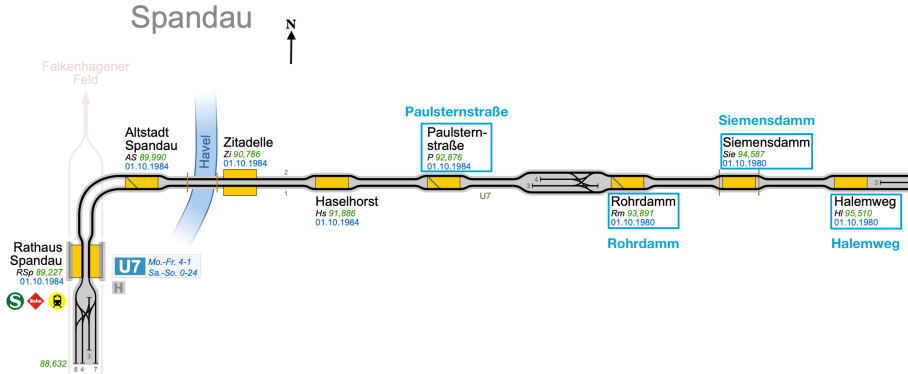 Close-up of the U7 track map in Spandau, by Christian Stade on www.gleisplanweb.de (CC BY-NC-SA). I’ve highlighted in blue the stations featured here in alphabetical order: Halemweg, Paulsternstrasse, Rohrdamm, Siemensdamm.