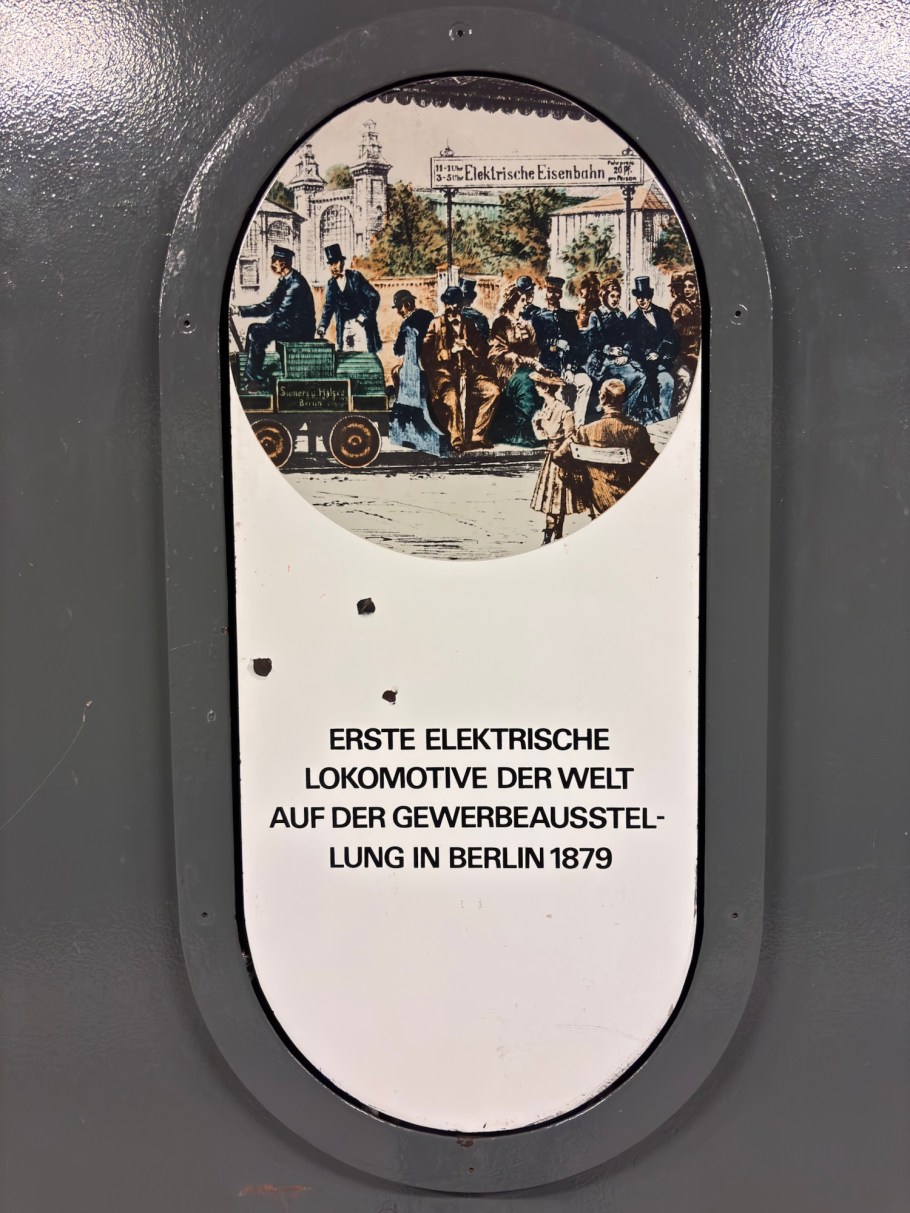 Erste elektrische Lokomotive der Welt auf der Gewerbeausstellung in Berlin, 1879 / The world’s first electric locomotive at the 1879 trade fair in Berlin: oh look, it’s Berlin company Siemens & Halske in the picture.
