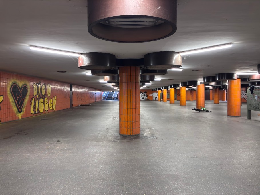 The Messedamm tunnel or underpass (Unterführung) is used as pedestrian and bicyclist passage underneath two very busy roads: the east-west Masurenallee and north-south Messedamm. Built primarily for access to the Messe Berlin, there is access to the big bus station (ZOB) and an S-Bahn Ringbahn station nearby. The setting with those orange columns and walls has been used as television and film backdrops. Compared to past archival images, all the bulbs from the large circular overhead lamps are either out or off.