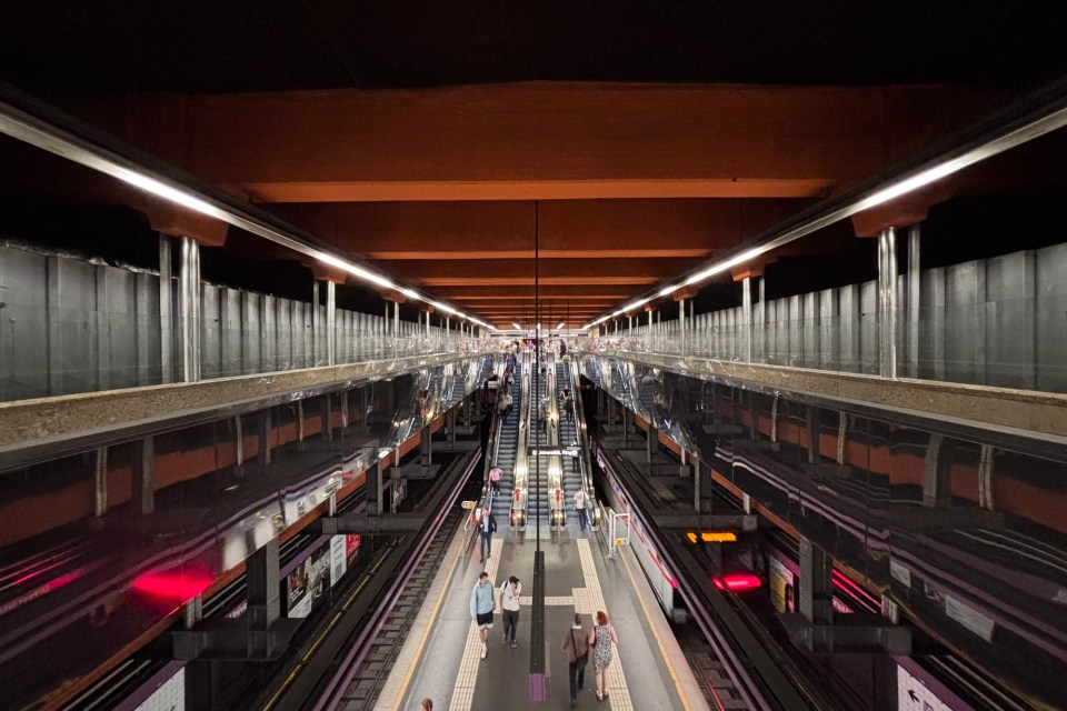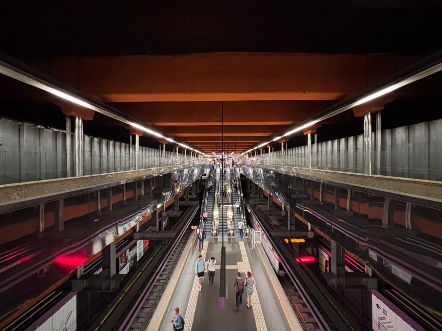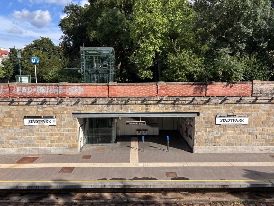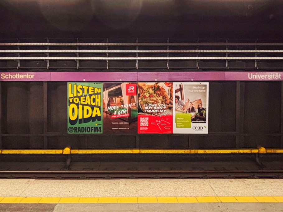 U2 station Schottentor, also known as Universität for the nearby University of Vienna. Wall adverts: “Listen to each Oida” / “I love you but don’t touch my pizza.”