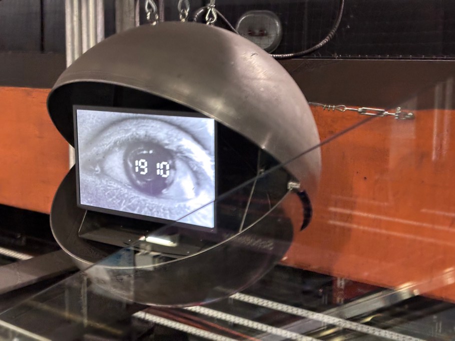 U2 station Schottentor: what faces commuters going up and down the escalators is “Einen Augenblick Zeit” (just a moment), a 1994 installation by Austrian artist Hofstetter Kurt. Transmitting an eyeful also helpfully includes the current time.