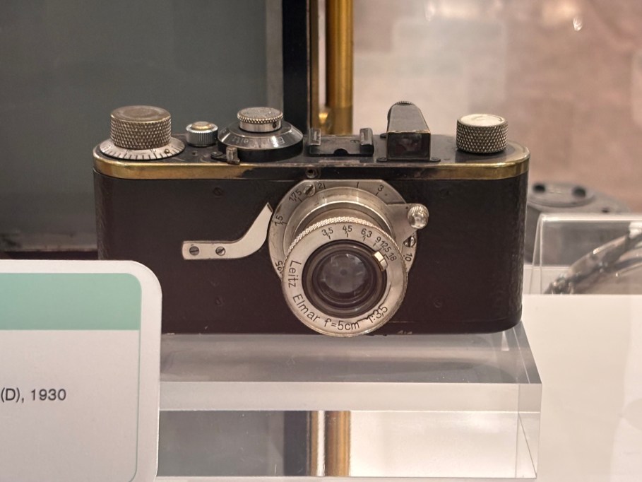 Front view, Leica I 35mm-camera: Ernst Leitz GmbH in Wetzlar (Germany), 1930. The word “Leica” is constructed from “Leitz” and “camera”.