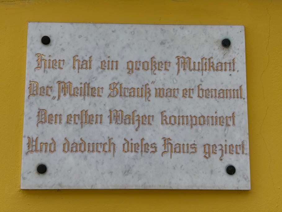 Johann Strauss Jr. at age 6 composed his 1st waltz at this location; this is memorialized by the plaque on the wall. “Hier hat ein großer Musikant / Der ‘Meister Strauß’ war er benannt / Den ersten Walzer komponiert / Und dadurch dieses Haus geziert.”