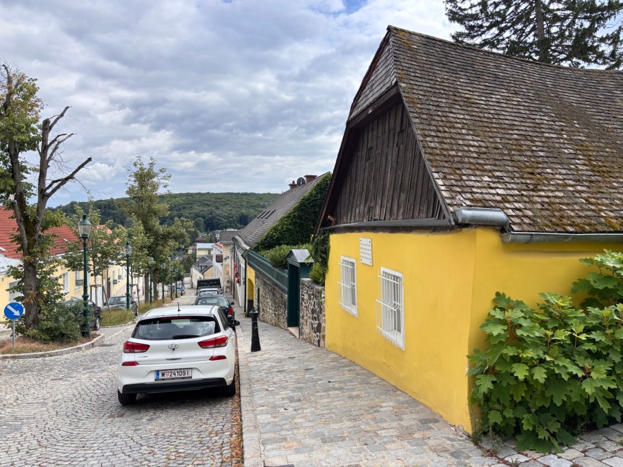 Near the top of Dreimarksteingasse with the village chapel at left and the yellow building (once occupied by the Strauss family) at right.