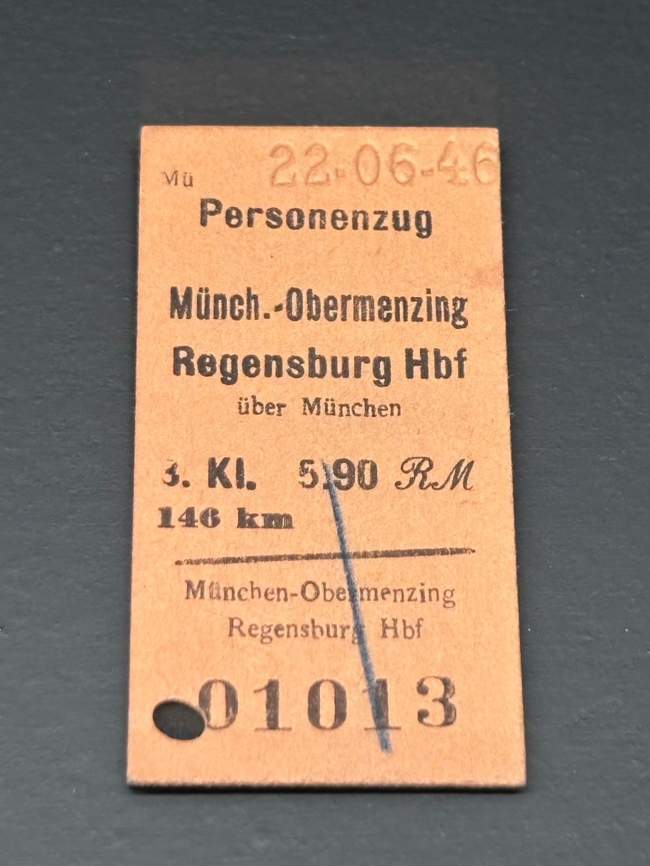 Train ticket in 3rd class, from Munich-Obermenzing to Regensburg, on 22 June 1946.